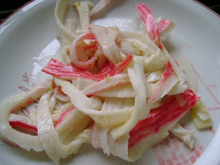 3 unidades de Kani ( que podem ser substituídos à gosto), desfiados e também ligeiramente refogados em azeite e alho